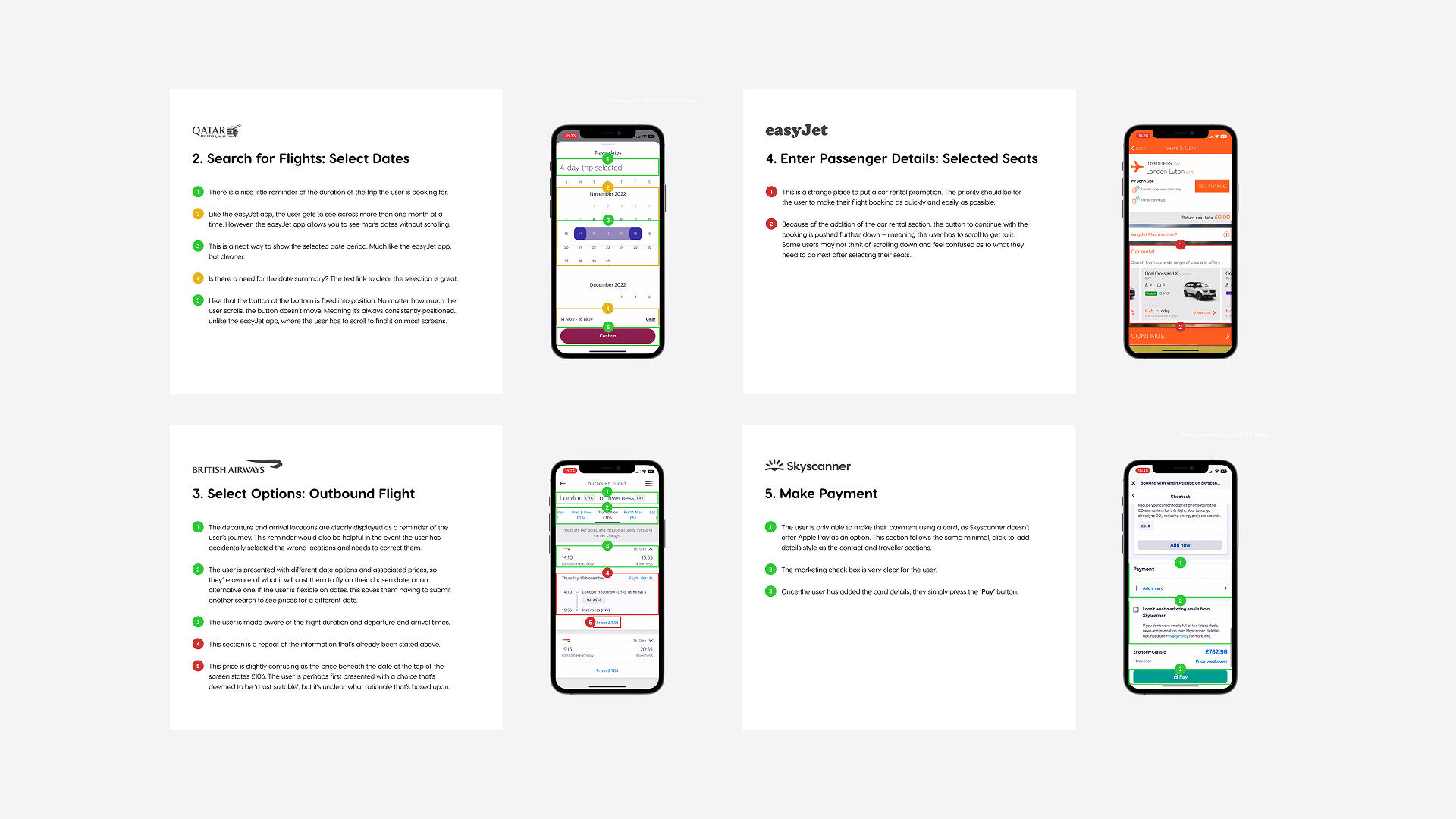 1. Competitive benchmarking of airline and travel apps: easyJet, British Airways, Qatar Airways, and Skyscanner — providing a mix of budget, premium, and aggregator experiences.